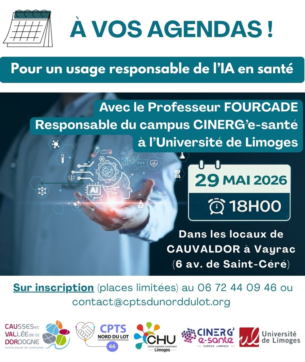 Dans un contexte où l’Intelligence Artificielle prend une place croissante dans le domaine de la santé, le Contrat Local de Santé de Cauvaldor et la CPTS Nord Lot organisent une conférence dédiée à ces enjeux majeurs pour les professionnels du territoire.