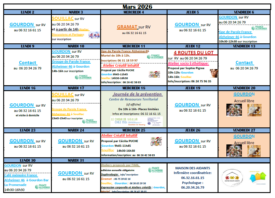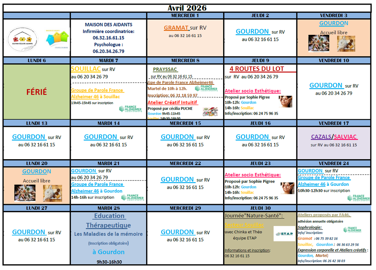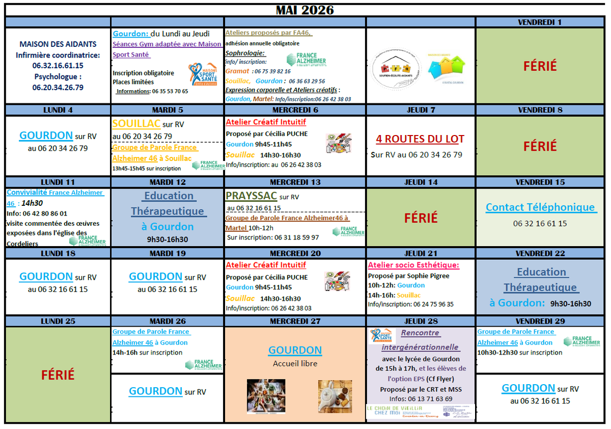 Ci-dessous les plannings des activités des mois d'avril et mai 2026 :